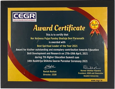 Maiyashree SheilejaDevi has been honored with significant awards recognizing her exemplary contributions to education, social development, and spiritual guidance. These honors celebrate her outstanding dedication to community service and her role in promoting positive societal transformation. They stand as a testament to her impactful spiritual and educational work across various sections of society.